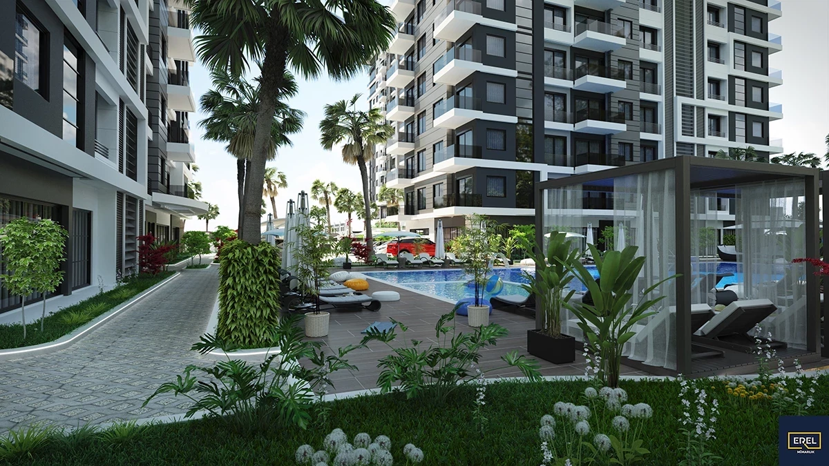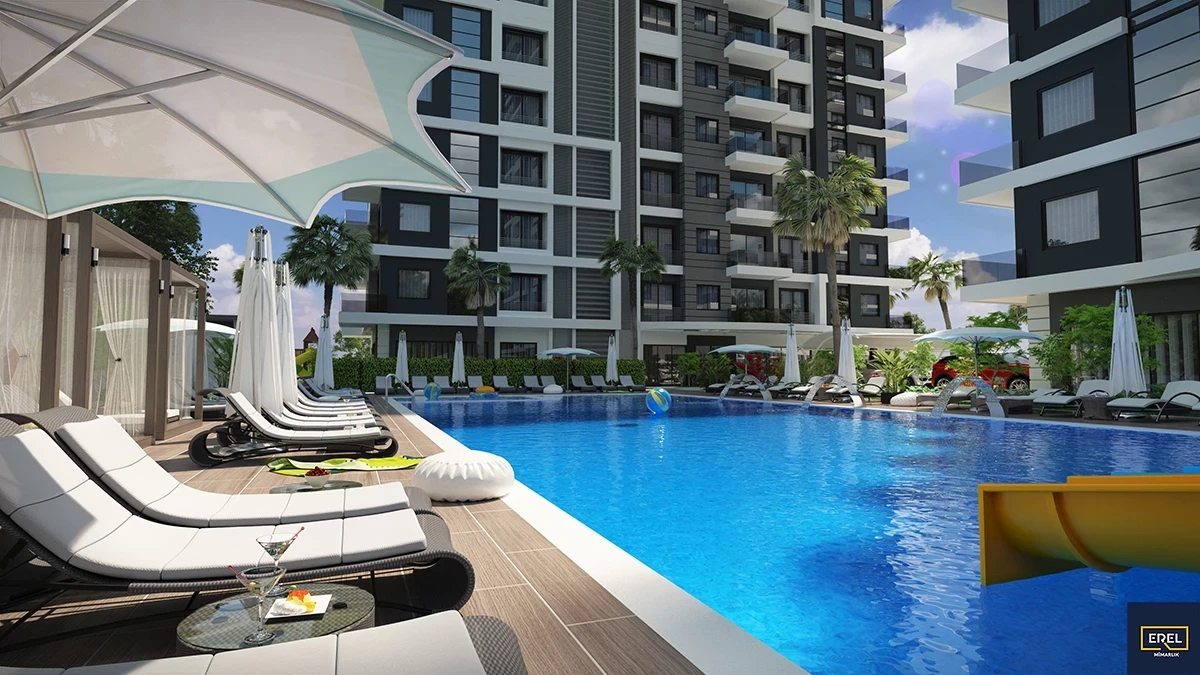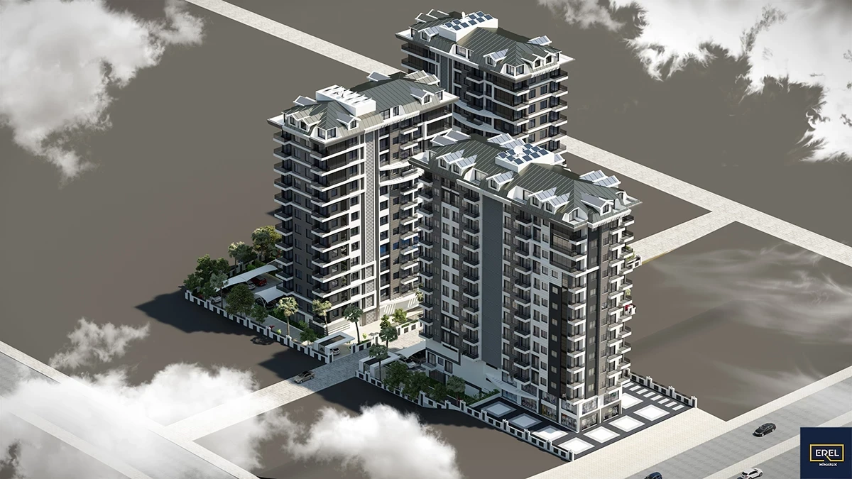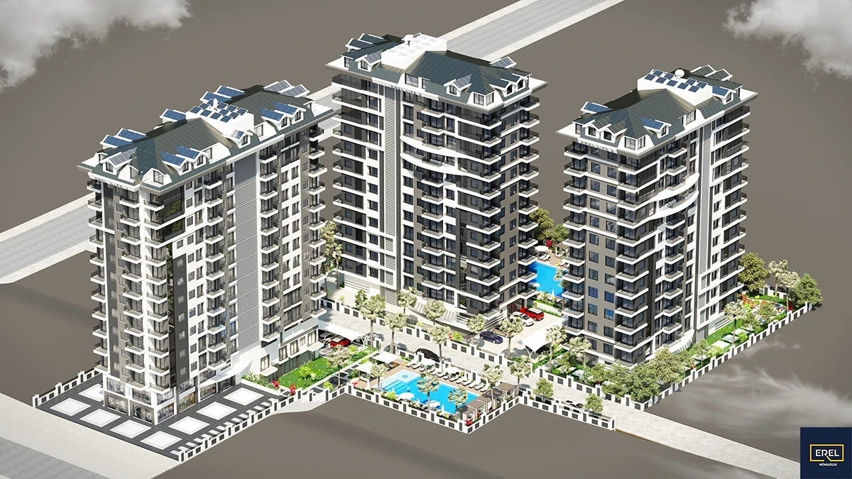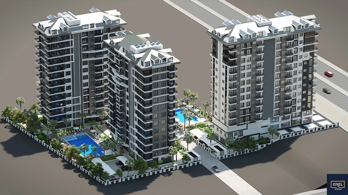 Die Fläche des Komplexes beträgt 6675 m2. 3 Blöcke mit 247 Wohnungen 2+1, 4+1 Maisonette-Grundrisse. Außenpool, Kinderrutschen, Loungebereich, Außenparkplatz, Kinderspielplatz, Gärten und Grünflächen, Innenpool, Hammam, Fitnessraum, Whirlpool, Massageraum, Sauna, Stahleingangstür, Wohnungen werden komplett fertiggestellt vermietet. Fälligkeitsdatum: 07.2024